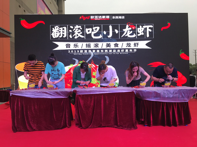 在别“虾”看·来“虾”吃的游戏环节,主持人随机抽取6名观众上台,每人一斤虾,最先吃完的三名观众可以获得我们精心准备的礼品。主持人宣布开始后,参赛人员便争分夺秒地吃着眼前的小龙虾,剥壳吃虾一套动作行云流水般顺畅。接下来的游戏环节中,上场的观众也是当仁不让,现场一片欢腾。